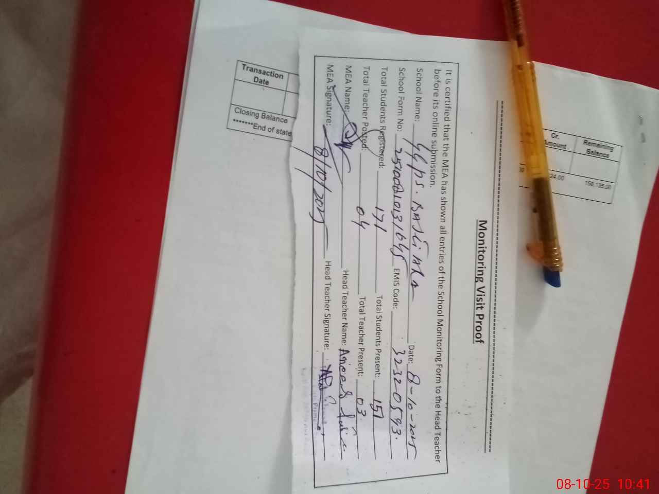 | Attendance Register | Head Teacher | MEA with School | Visit Proof |