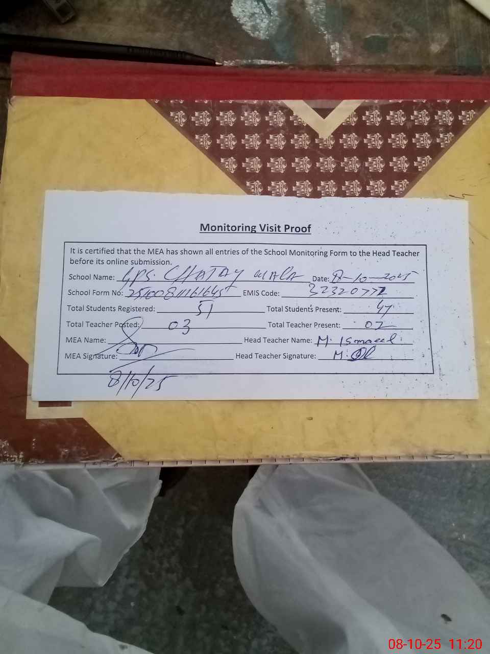 | EMIS Code: 32320772 | Name of School: GPS CHATTAY WALA | |||