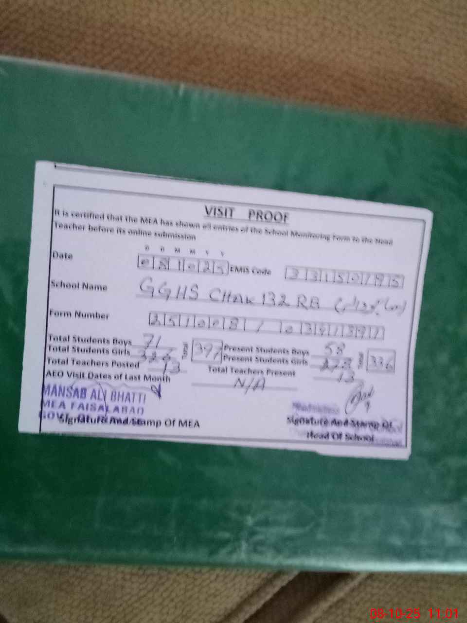 | Certified that this School was Inspected by the Undersigned MEA/DMO Today and the Information Stated Above is as Per Record. | |||||