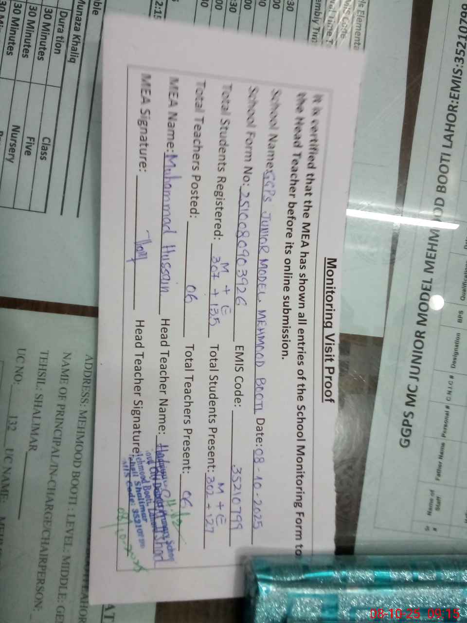 | EMIS Code: 35210799 | Name of School: GGPS JUNIOR MODEL MEHMOOD BOOTI (EX-MCL) | |||