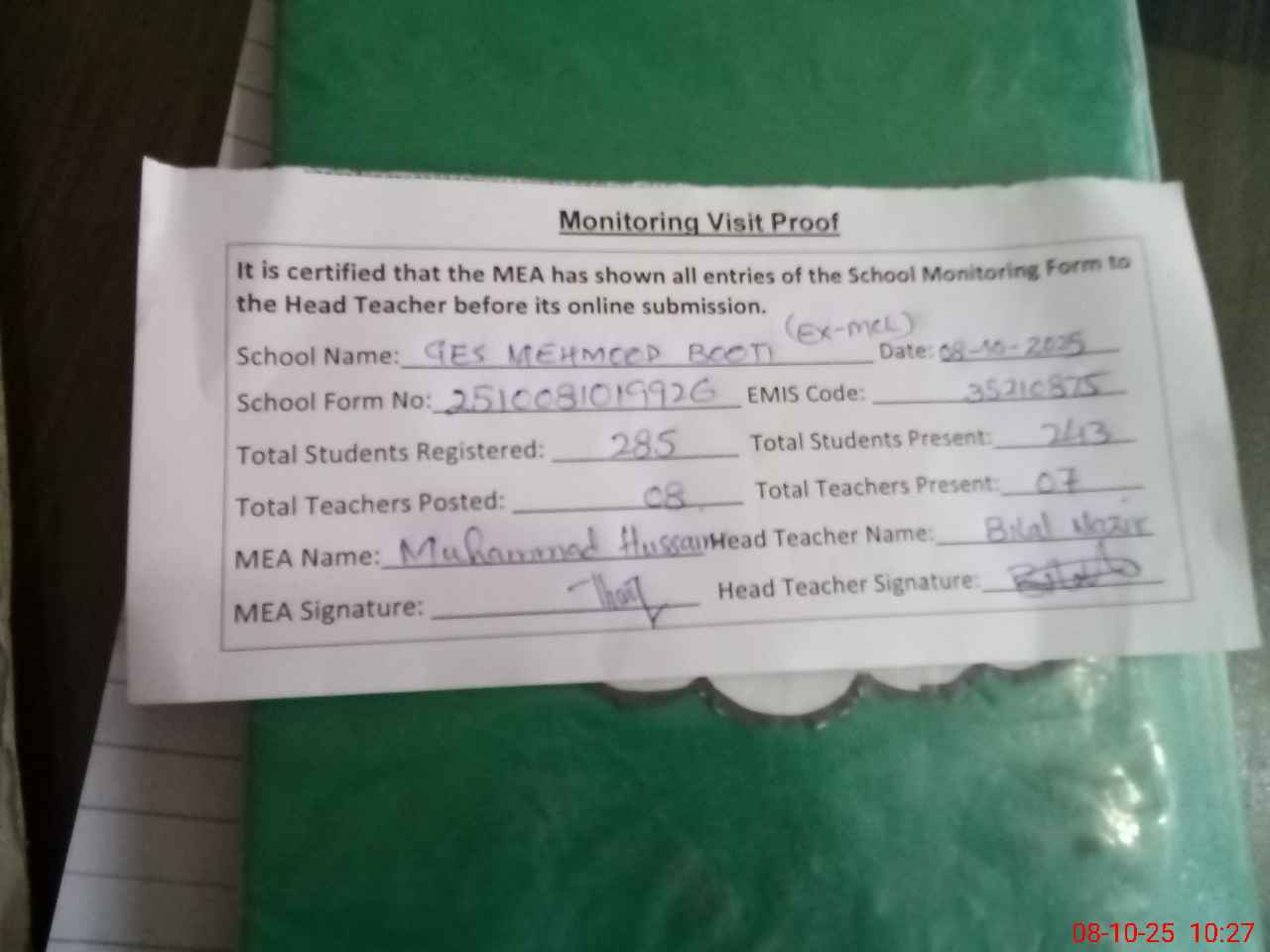 | EMIS Code: 35210875 | Name of School: GES MEHMOOD BOOTI (EX-MCL) | |||
