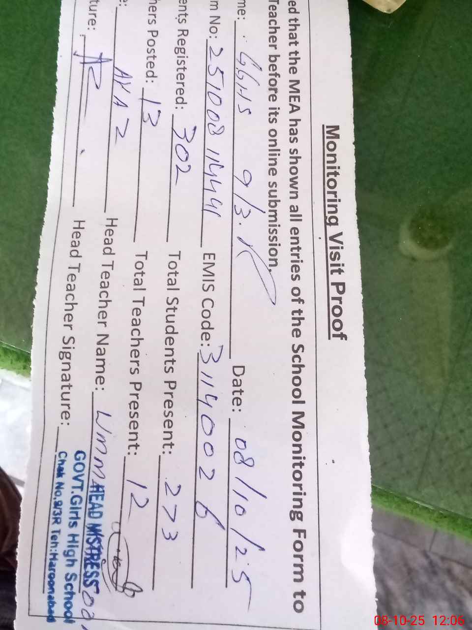 | EMIS Code: 31140026 | Name of School: GGHS CHAK NO 9/3-R | |||