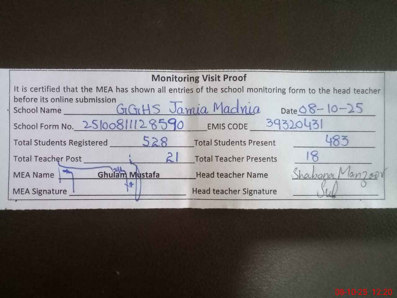 | Attendance Register | Head Teacher | MEA with School | Visit Proof |