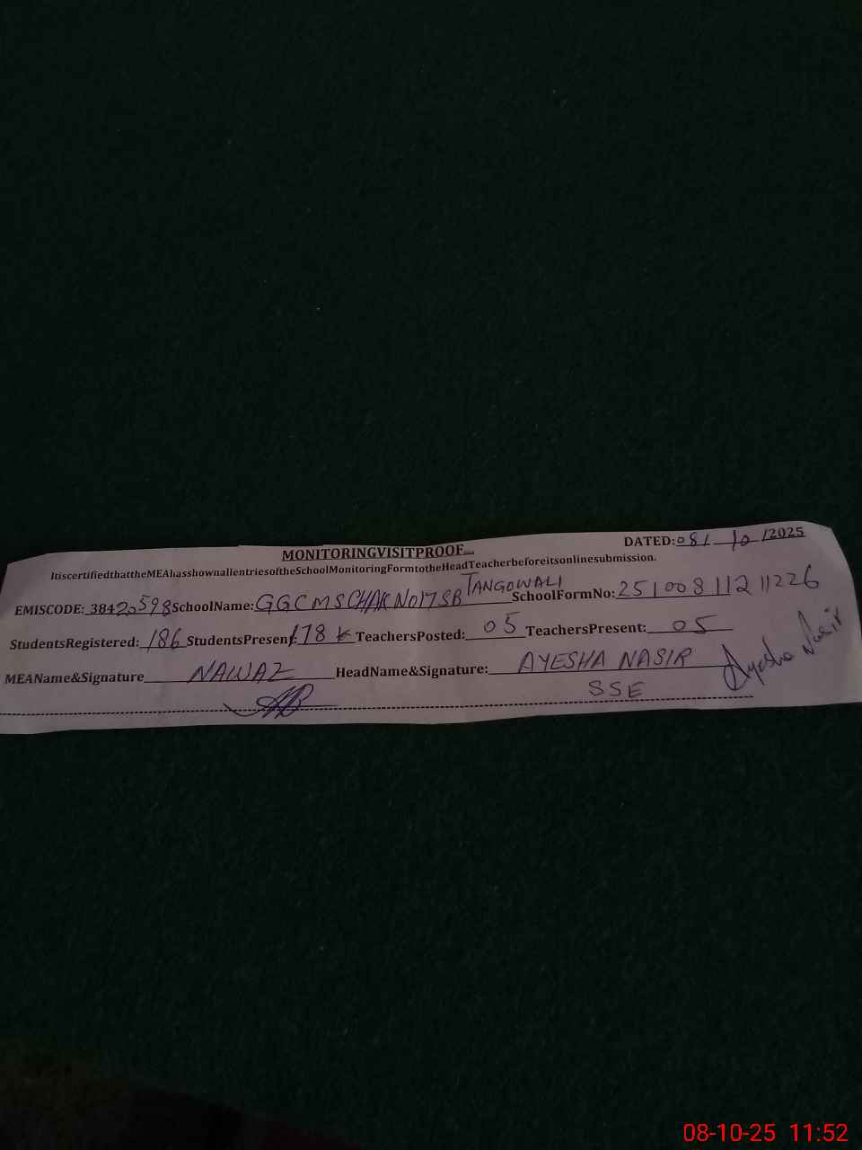 | Monitoring Date: 08-10-2025 | Start Time: 08-10-2025 11:21 AM | End Time: 08-10-2025 11:54 AM | Name of MEA: MU**** NA**** | |