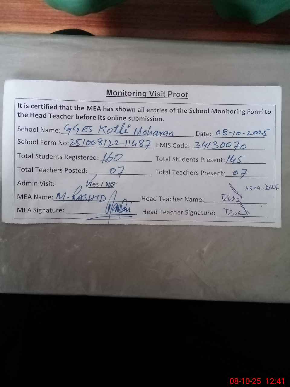 | Attendance Register | Head Teacher | MEA with School | Visit Proof |