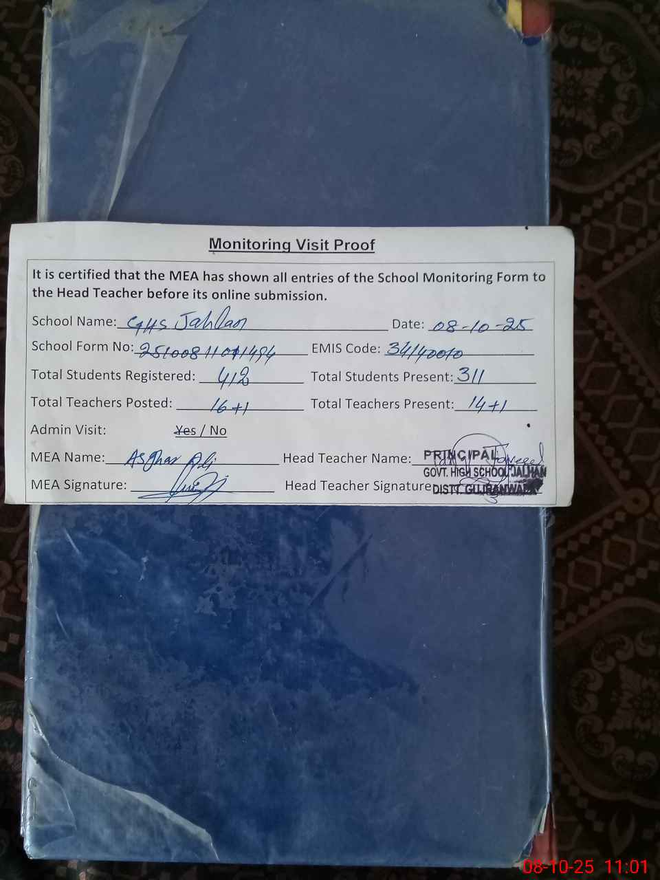 | Attendance Register | Head Teacher | MEA with School | Visit Proof |