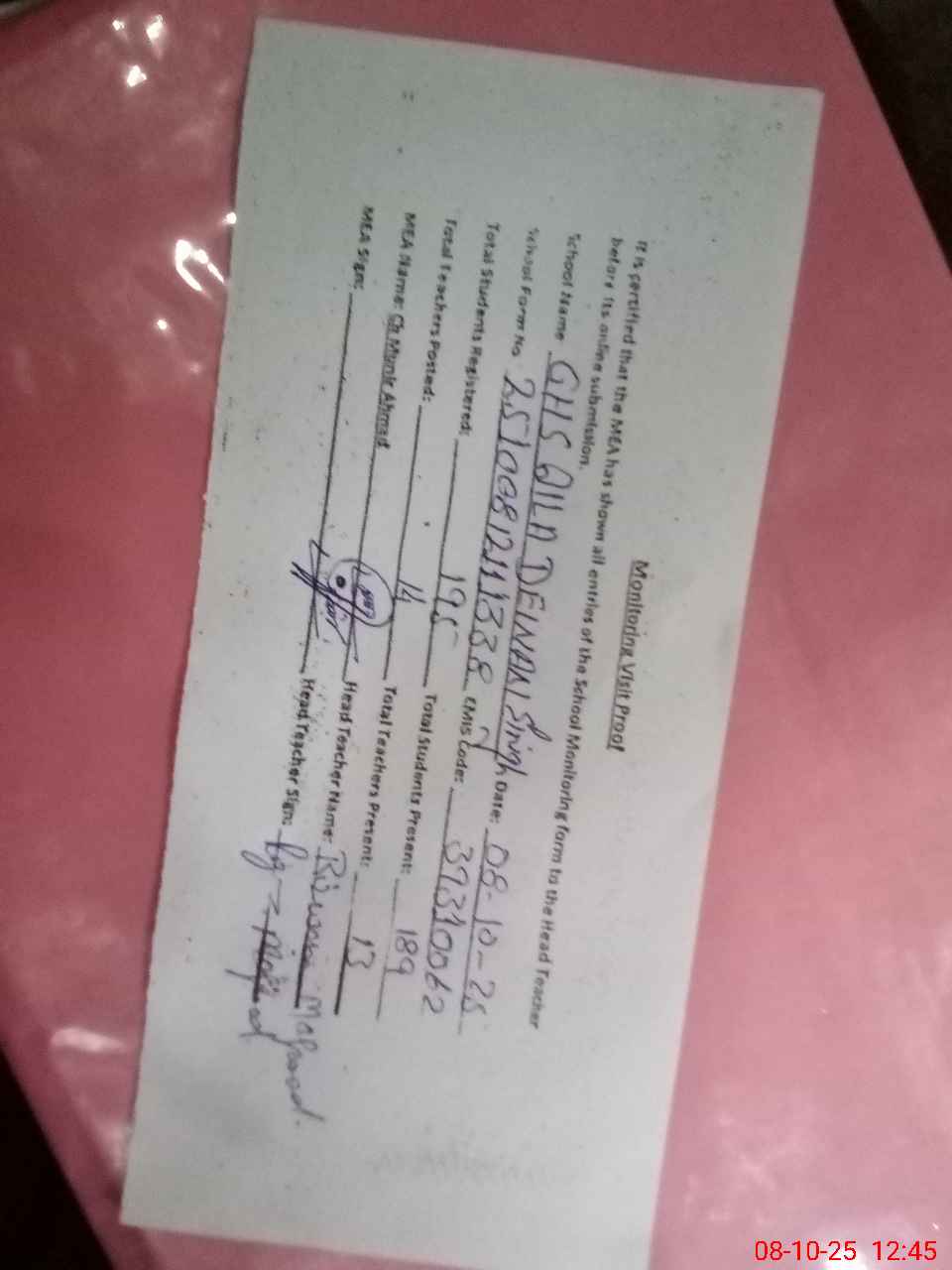 | Attendance Register | Head Teacher | MEA with School | Visit Proof |