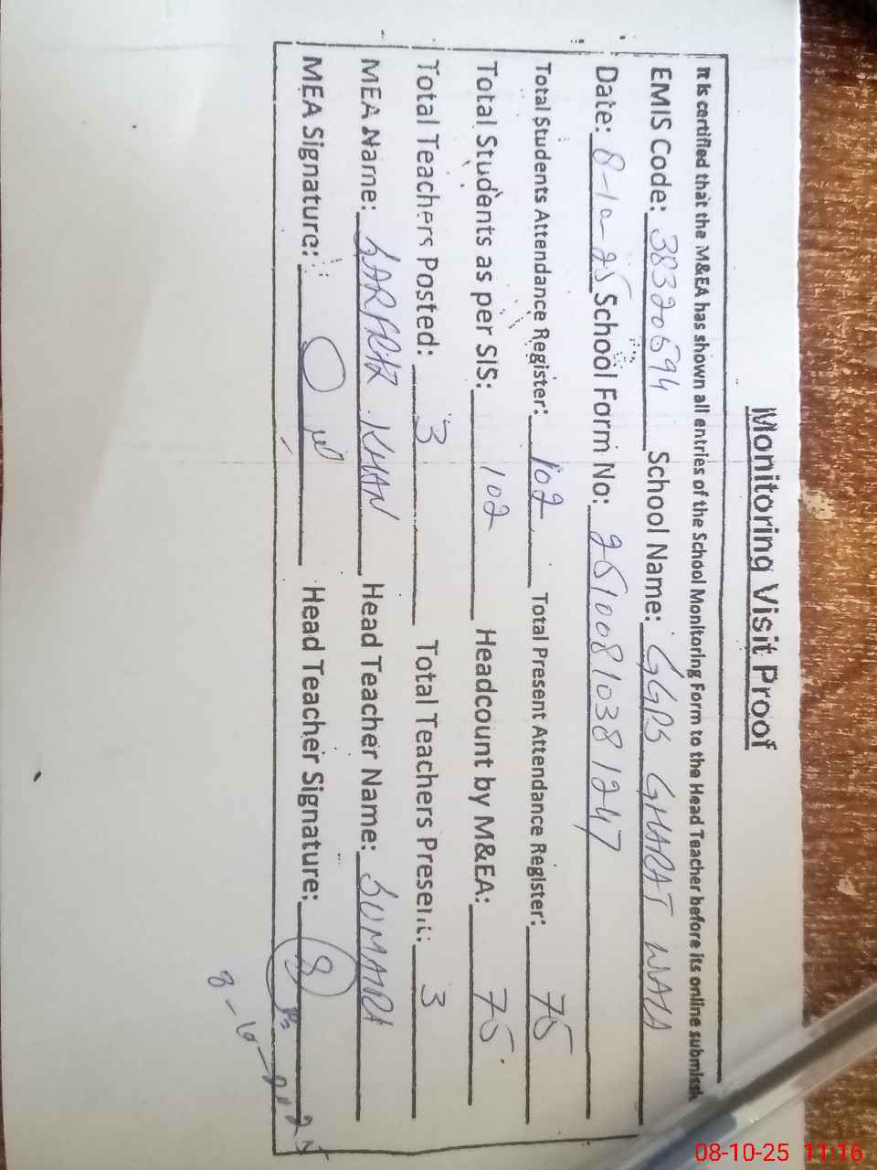 | Attendance Register | Head Teacher | MEA with School | Visit Proof |