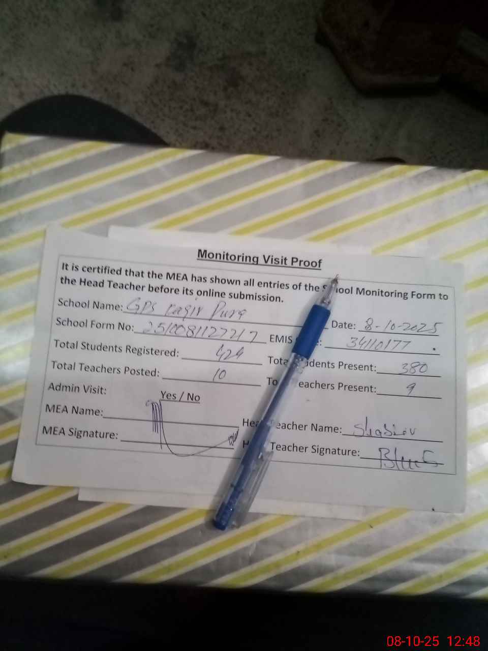 | Attendance Register | Head Teacher | MEA with School | Visit Proof |
