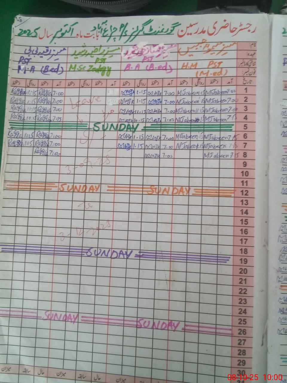 | CNIC | Full Name | Designation | R/C | Absence During Last Calender Month |