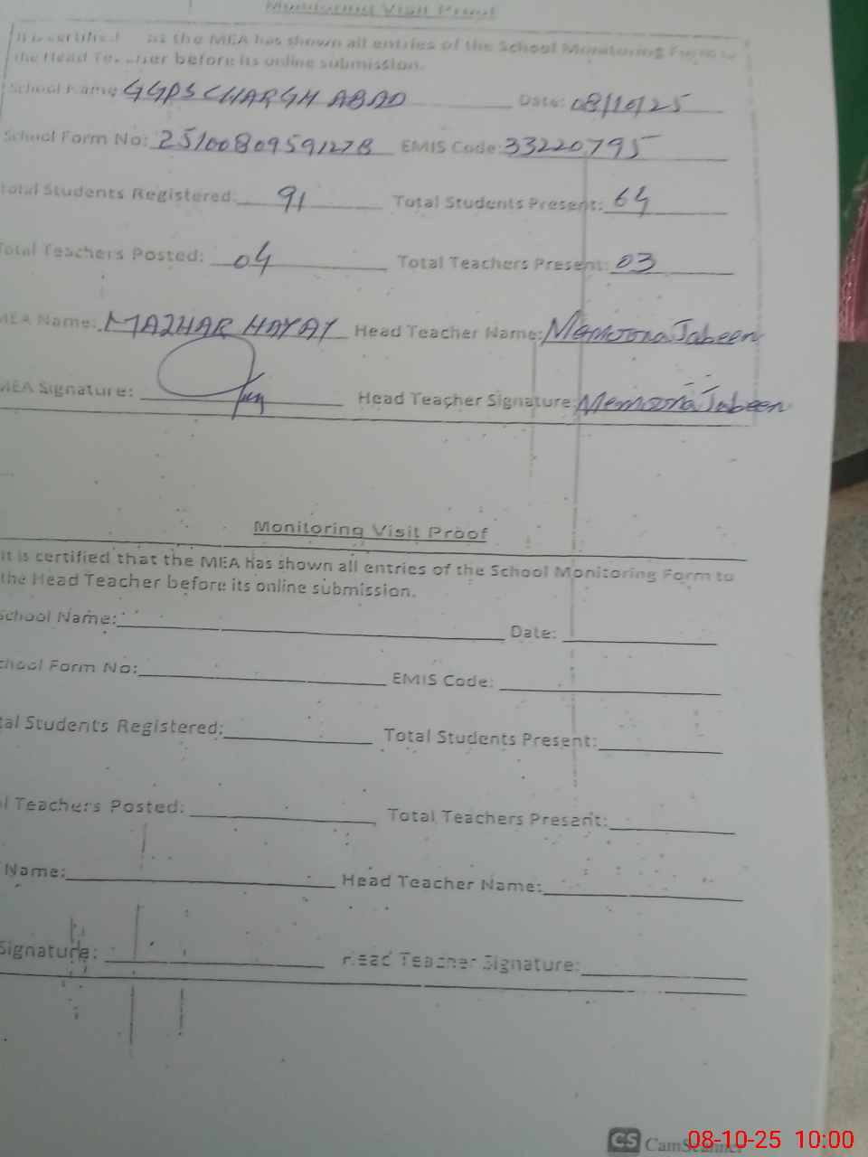 | Attendance Register | Head Teacher | MEA with School | Visit Proof |