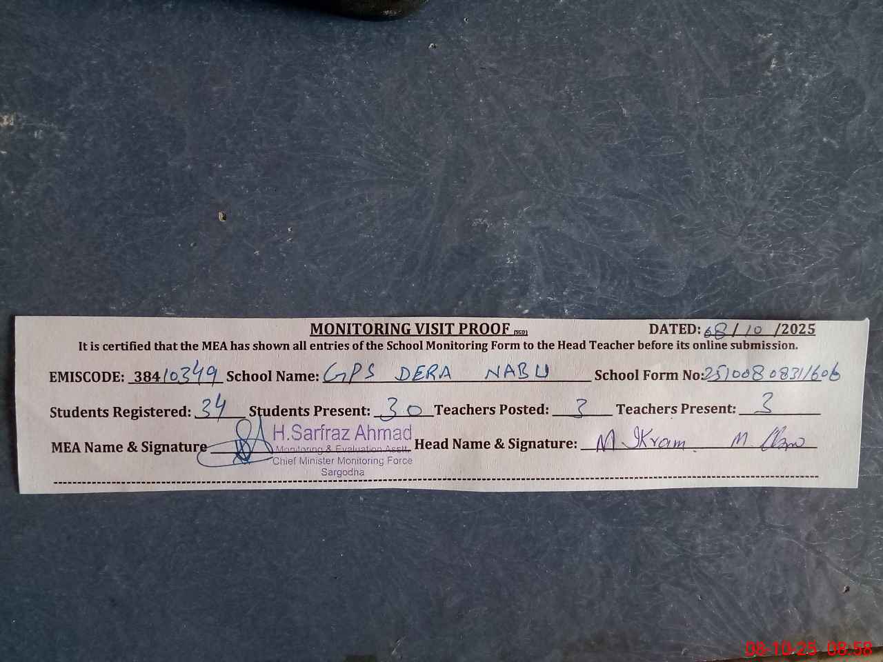 | Attendance Register | Head Teacher | MEA with School | Visit Proof |