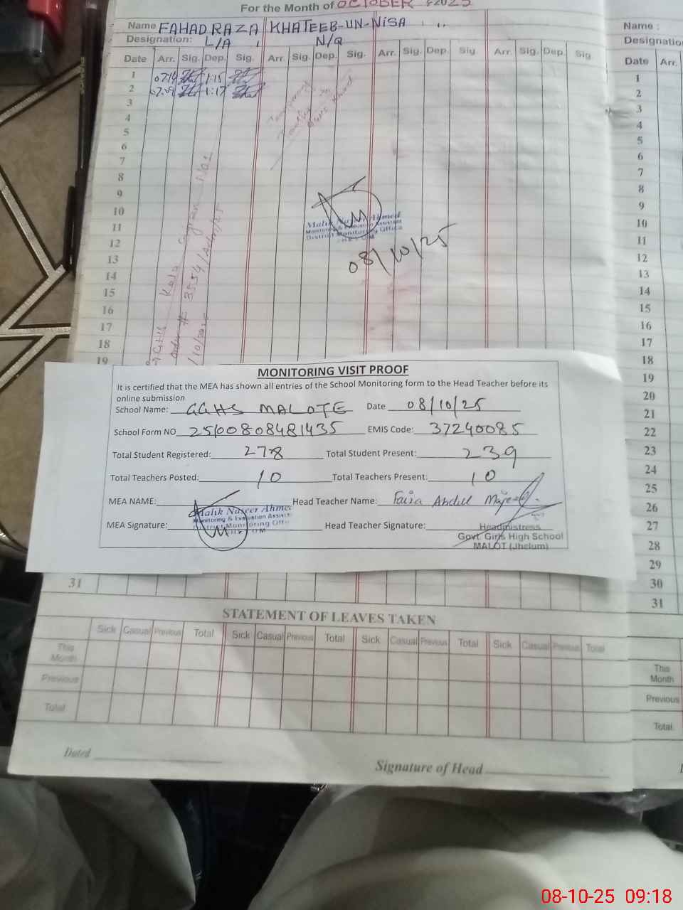 | Attendance Register | Head Teacher | MEA with School | Visit Proof |