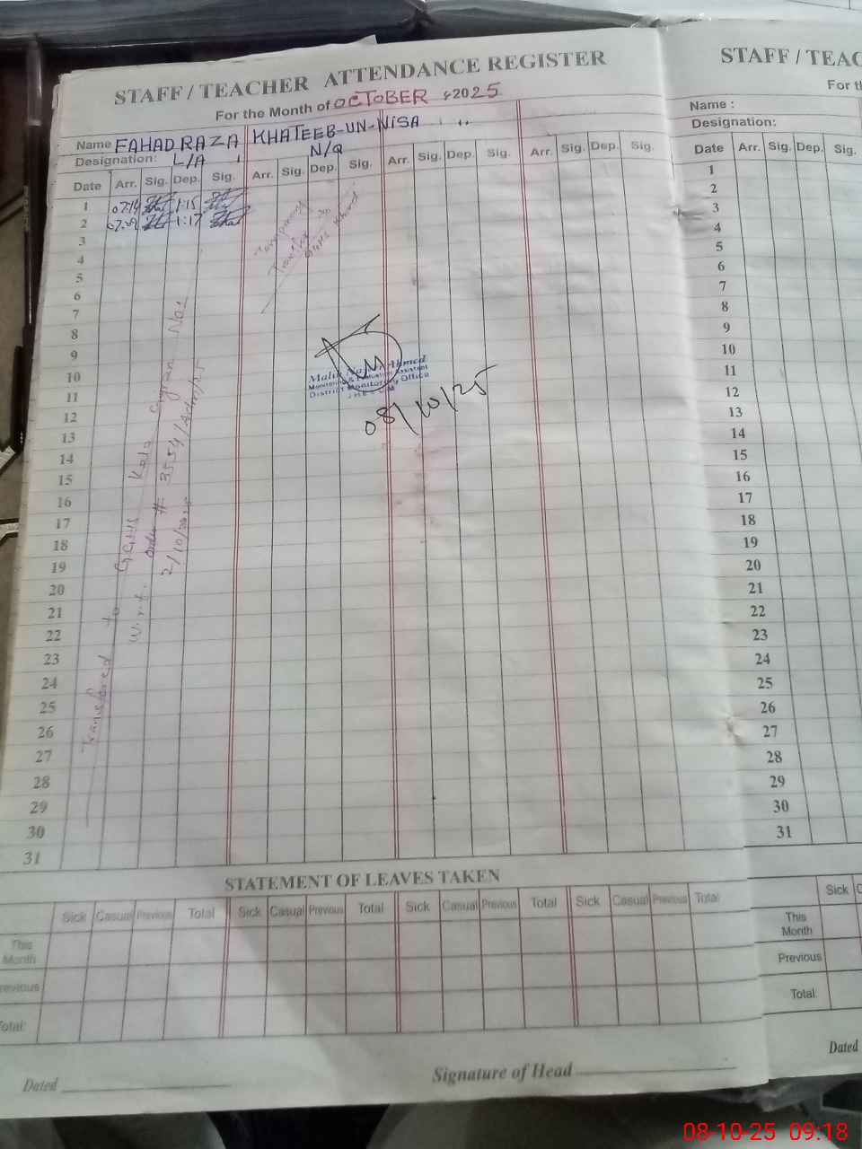 | Monitoring Date: 08-10-2025 | Start Time: 08-10-2025 08:48 AM | End Time: 08-10-2025 09:19 AM | Name of MEA: Na**** Ah**** | |