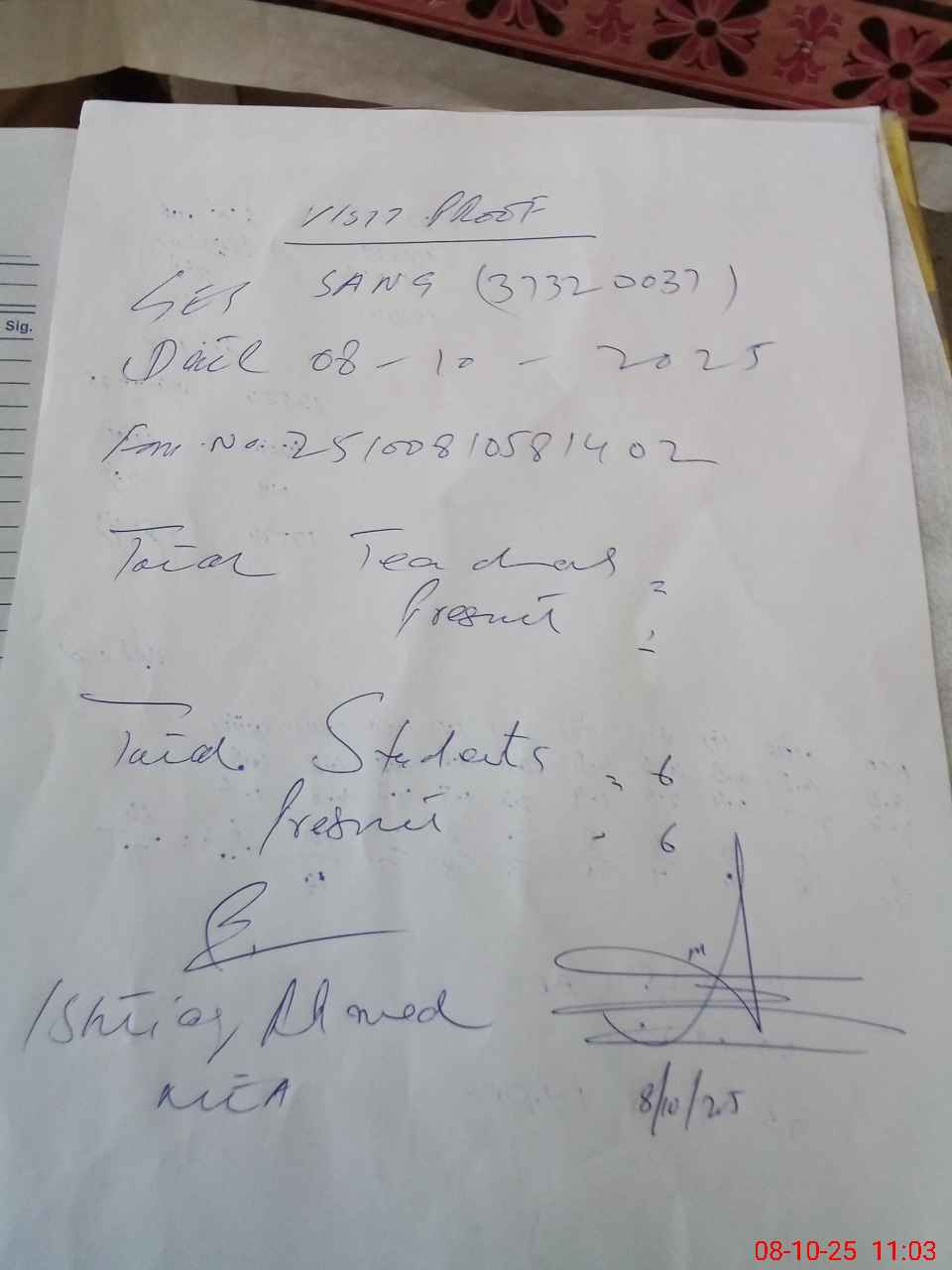 | Attendance Register | Head Teacher | MEA with School | Visit Proof |