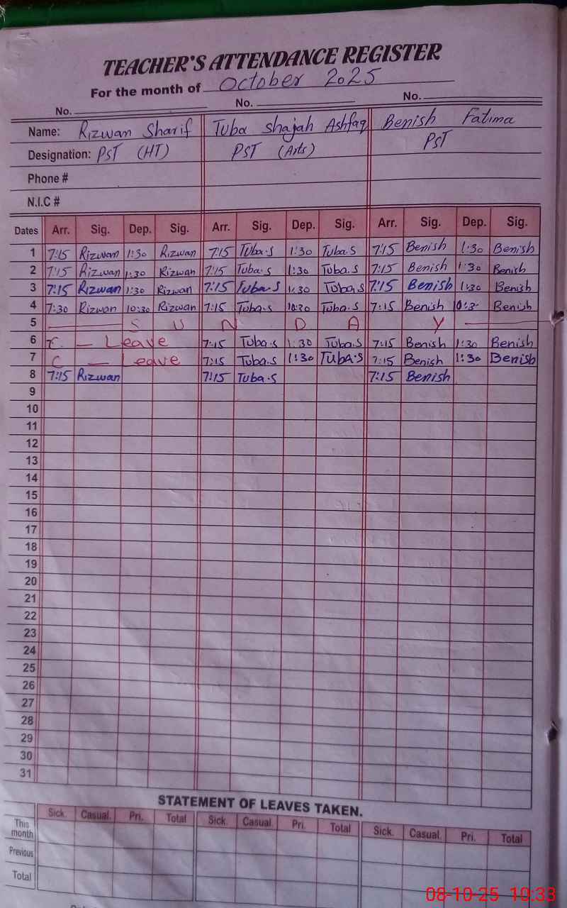 | Name: RI**** SH**** Designation: (School Headmaster's/Headmistress's) PST Phone/Cell Number: 03**** |