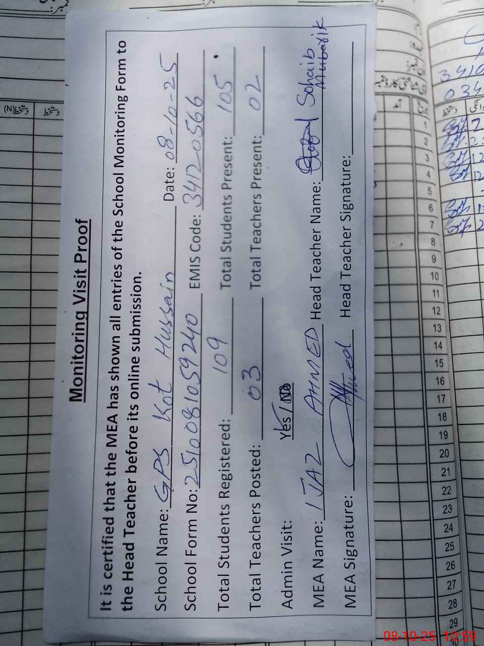 | Attendance Register | Head Teacher | MEA with School | Visit Proof |
