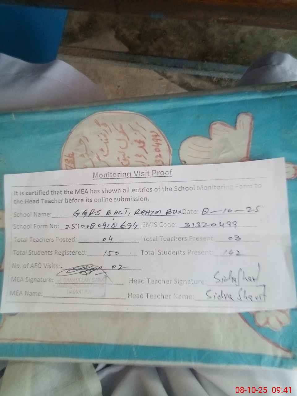 | Attendance Register | Head Teacher | MEA with School | Visit Proof |