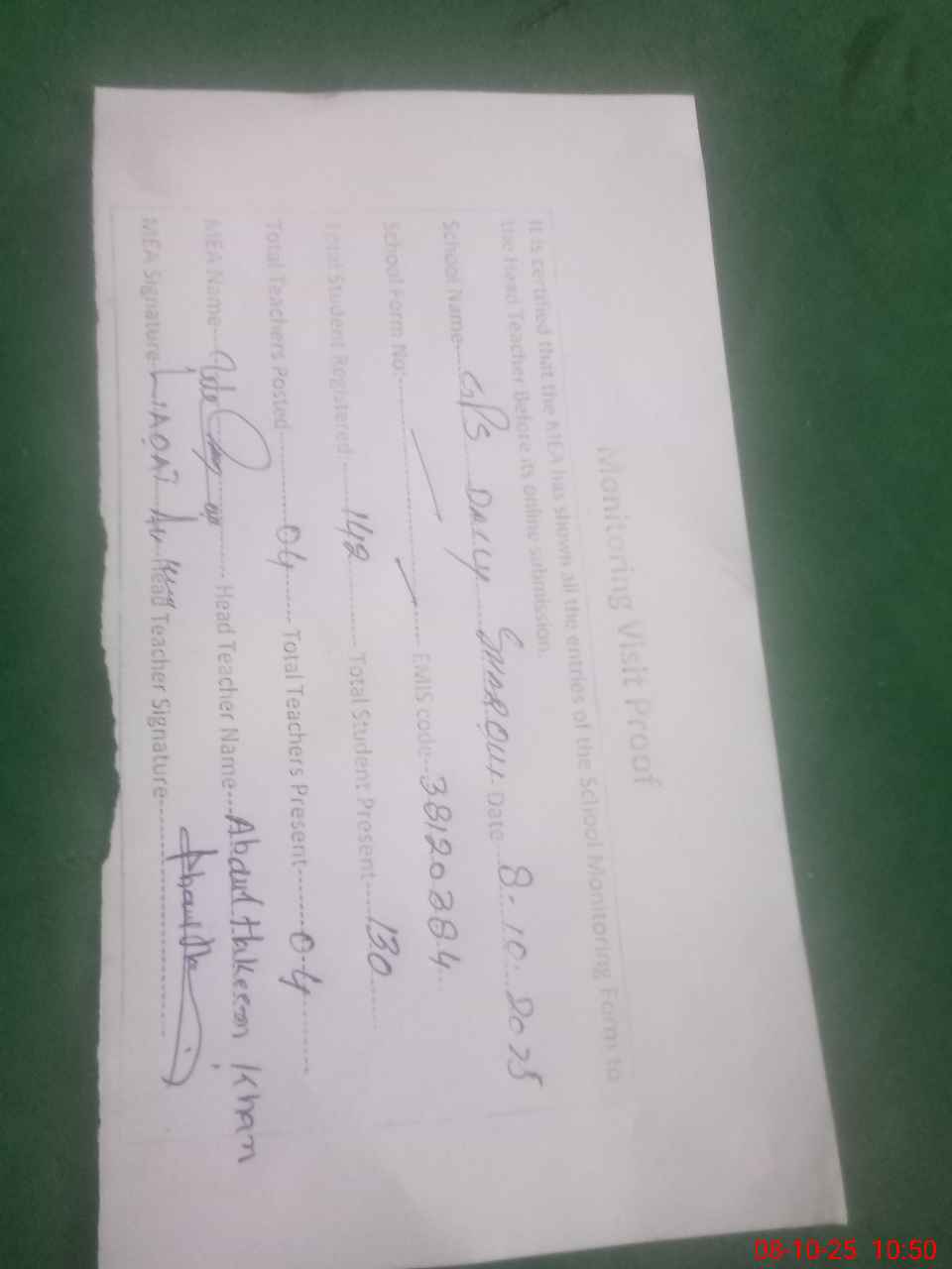 | Attendance Register | Head Teacher | MEA with School | Visit Proof |