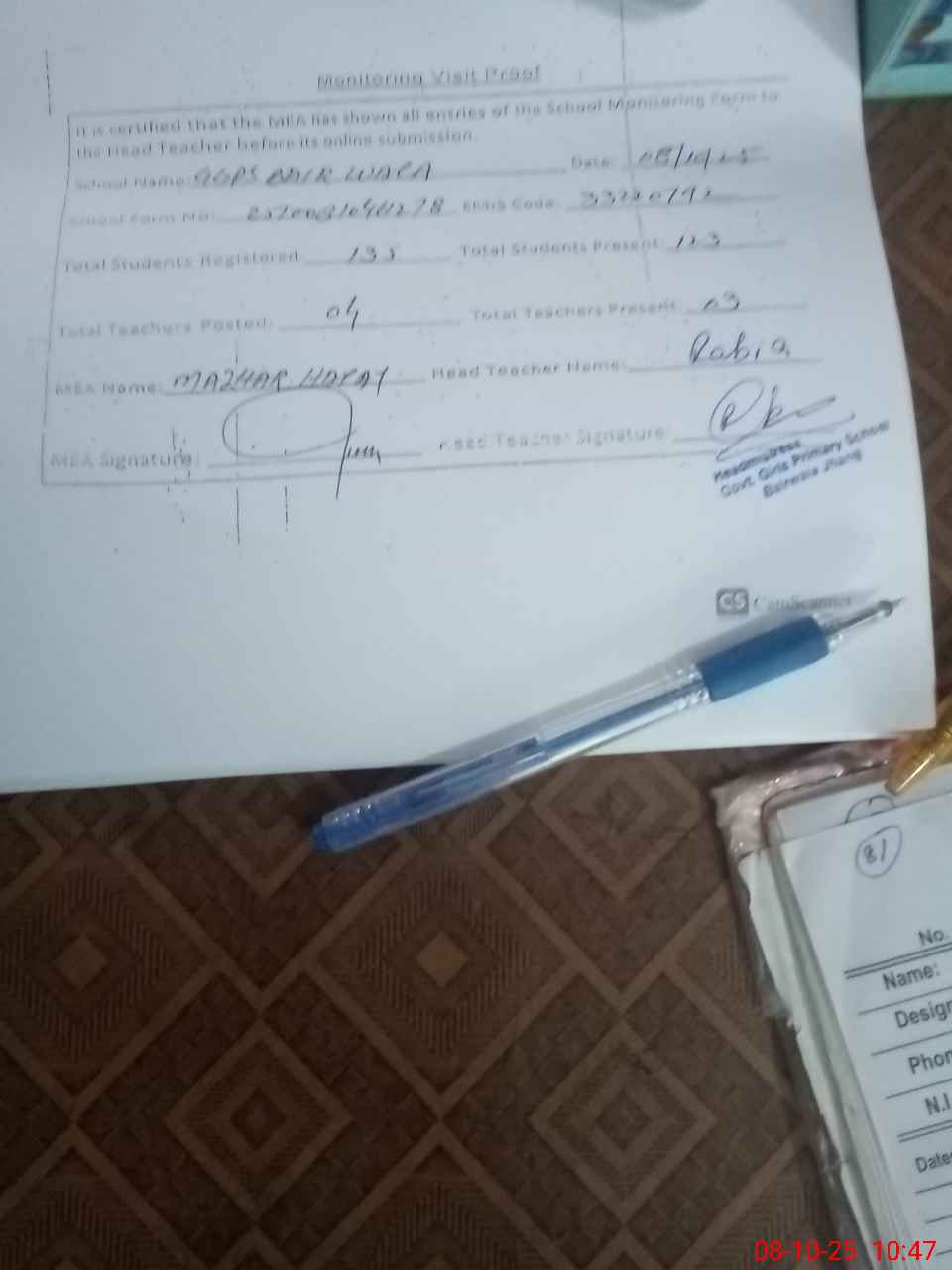 | Attendance Register | Head Teacher | MEA with School | Visit Proof |