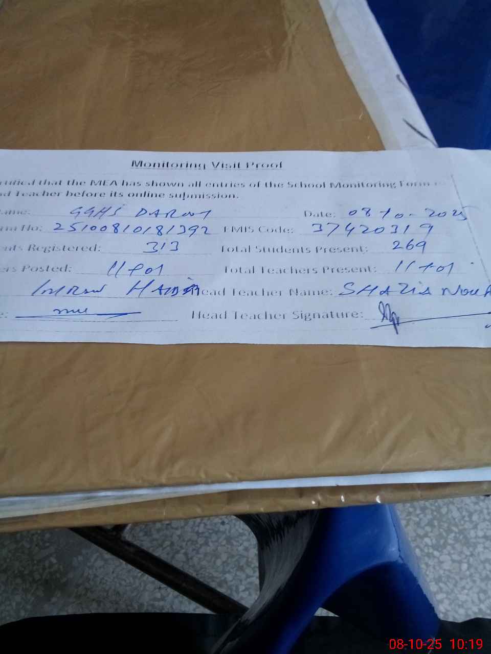 | Attendance Register | Head Teacher | MEA with School | Visit Proof |