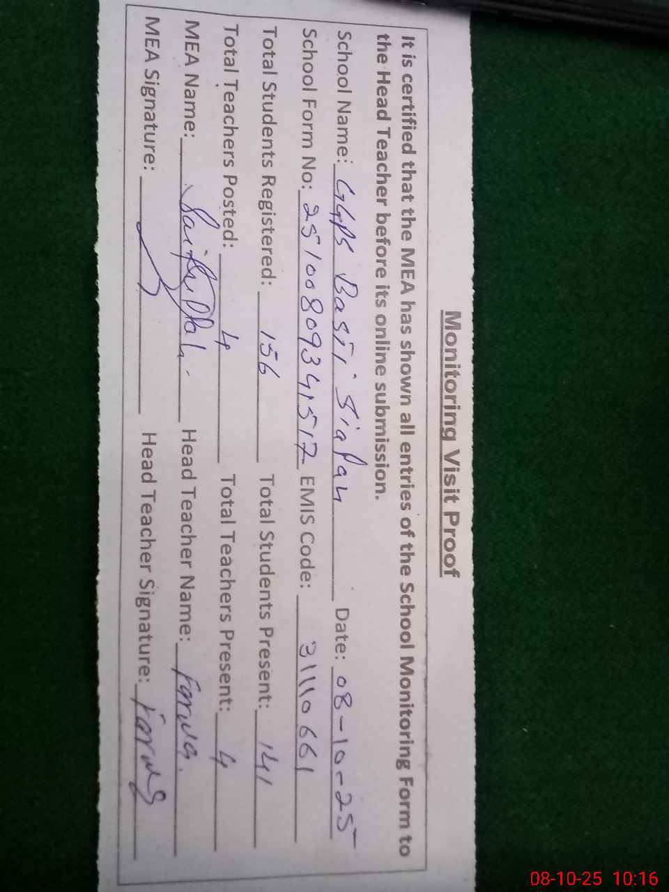 | Attendance Register | Head Teacher | MEA with School | Visit Proof |