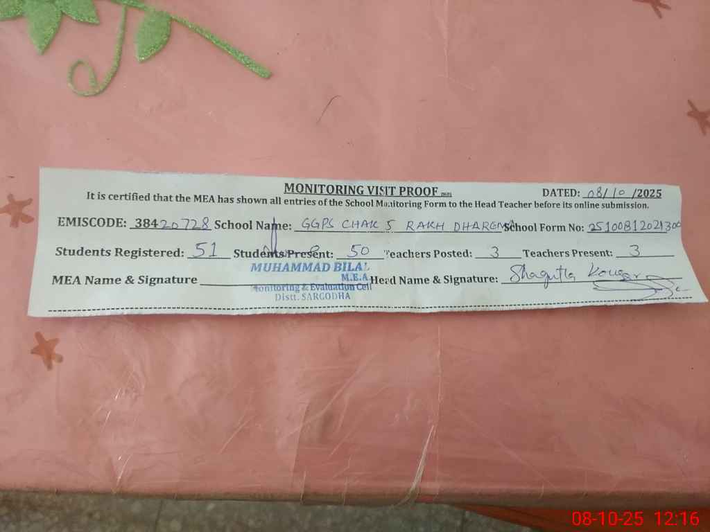 | EMIS Code: 38420728 | Name of School: GGPS CHAK NO.5 RAKH DHAREMA | |||