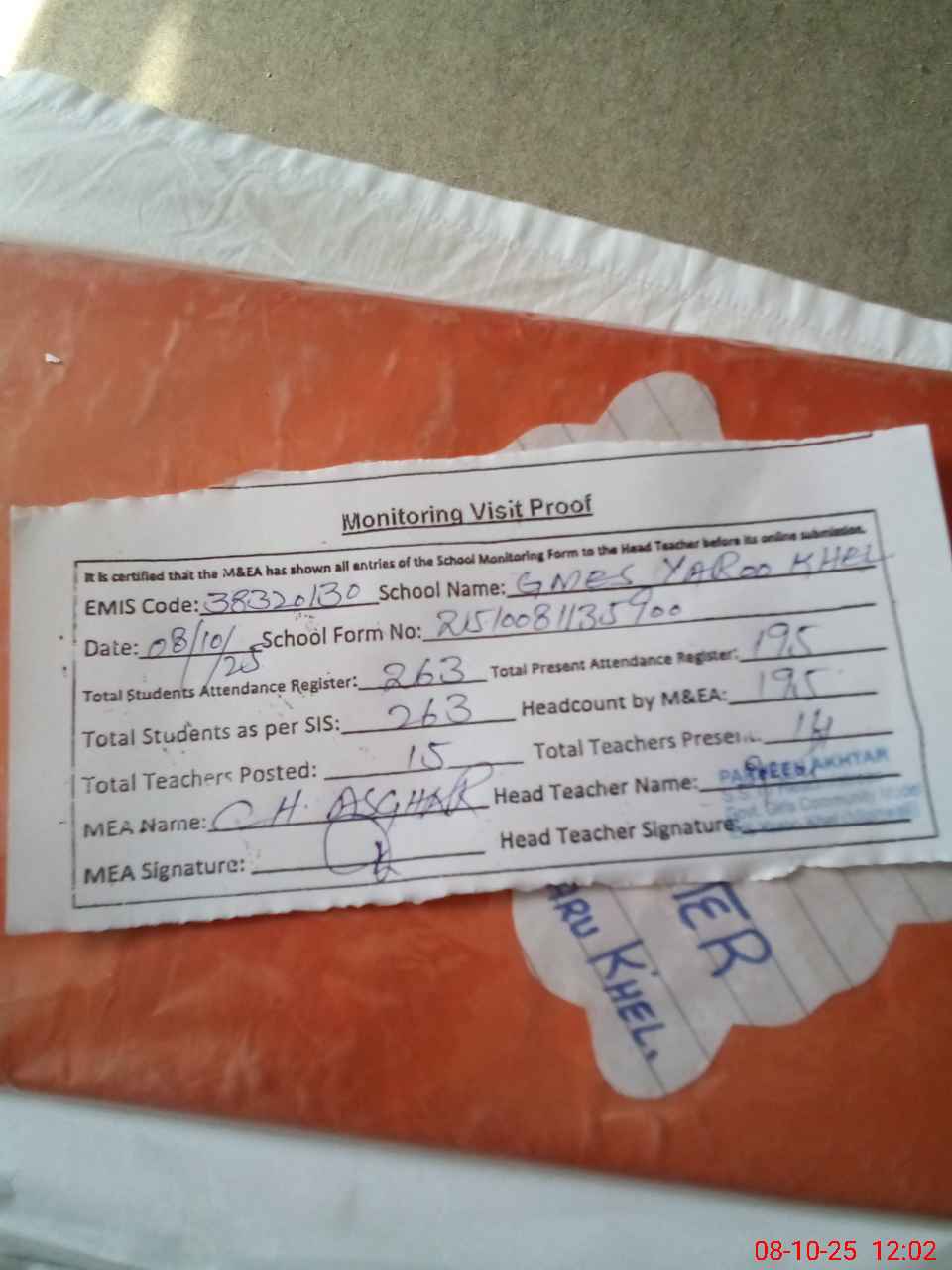 | Attendance Register | Head Teacher | MEA with School | Visit Proof |