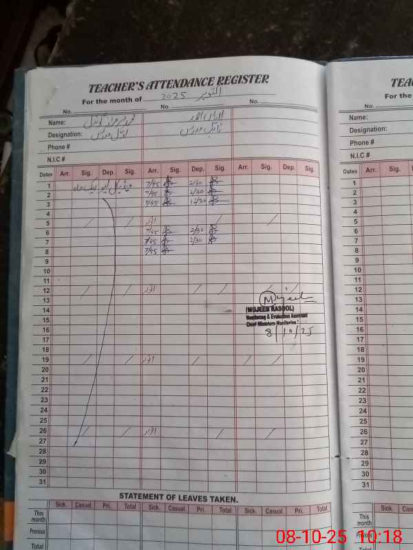 | Remarks (Use Separate Page if Required): During visit found Head Teacher Sarfraz marked on medical leave on attendance register but approved medical leave not available | |||||