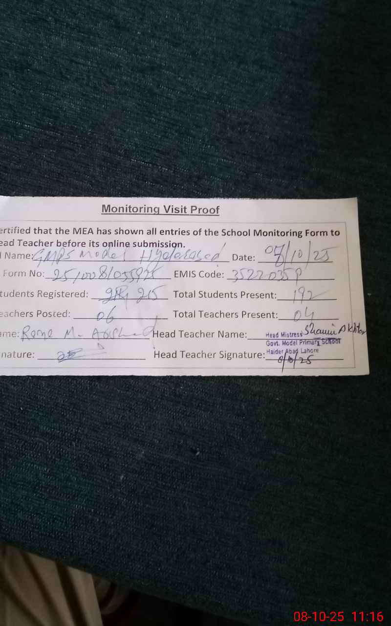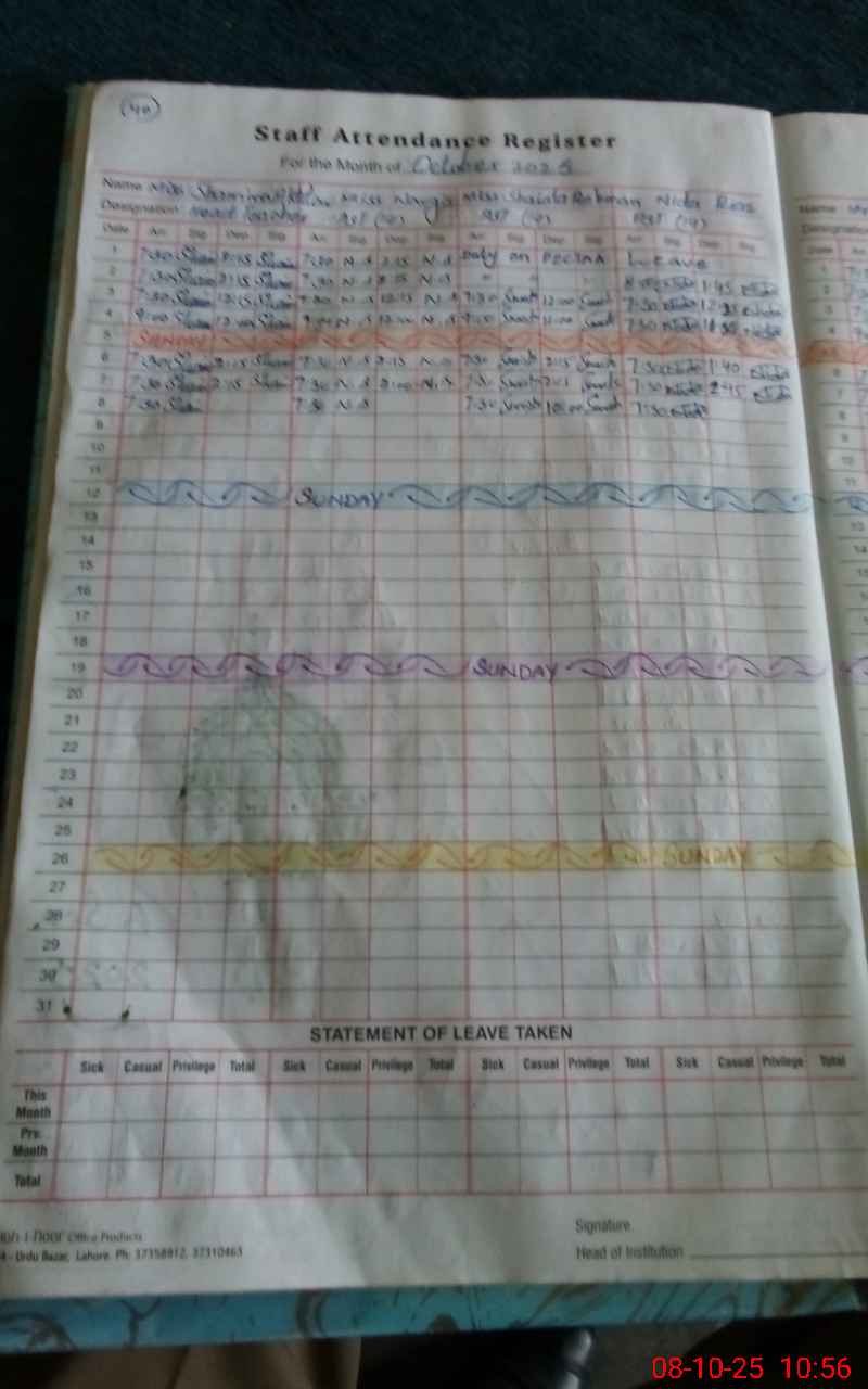 | Remarks (Use Separate Page if Required): NSB and FTF record not maintain properly method NSB record on SIS not maintain from June 2023 School cleaning not satisfactory 05 Class rooms declare Dangerous locally not building department School have an other Camp Chah Blaki Class One Two three sitting there Some portion of boundary Wall collapse due to raining Mark partially Teacher Hamna Sattar ESE long time Absent from August 2024 to date but still no any action taken against her Teacher Shaista Rehman PST attendance on register mark present but she Was not physically present in school at 1050 HRS so according to monitoring sop mark her Absent today 35220359 | |||||