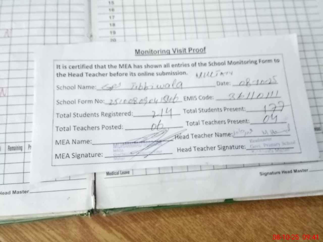 | Attendance Register | Head Teacher | MEA with School | Visit Proof |
