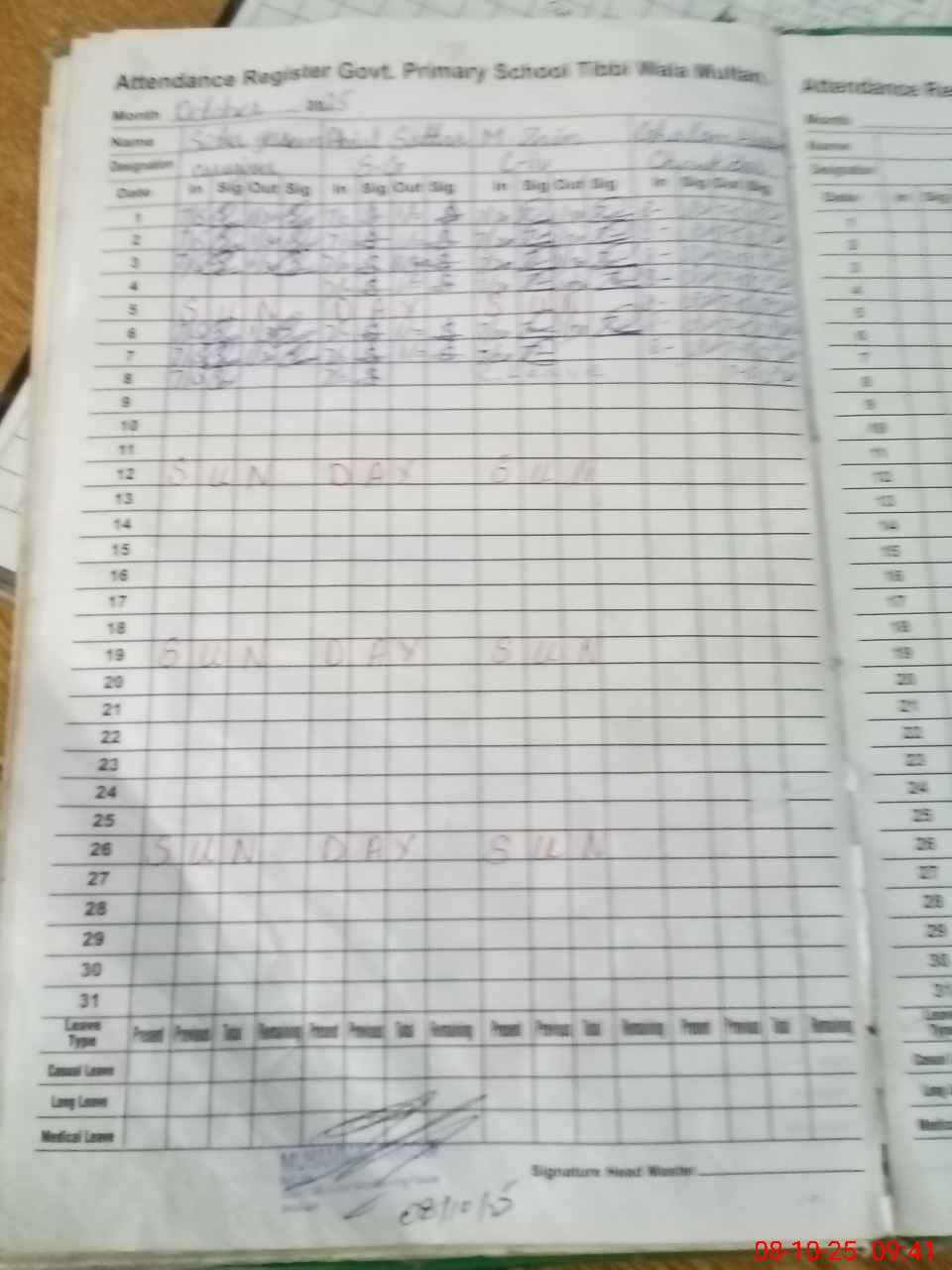 | Remarks (Use Separate Page if Required): Rosenamcha not maintained in October and September 25 Afternoon 7th class students daily attendance not marked as a whole in October 25 Two class iv attached here 1 class iv Zain today on casual leave 2 chokidar Ghulam Hassan present today | |||||