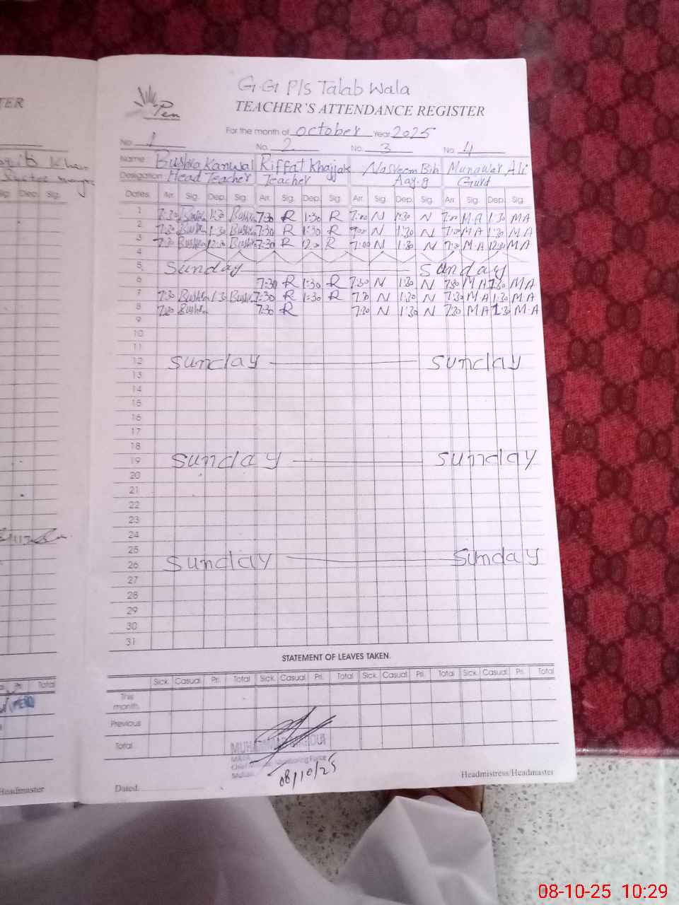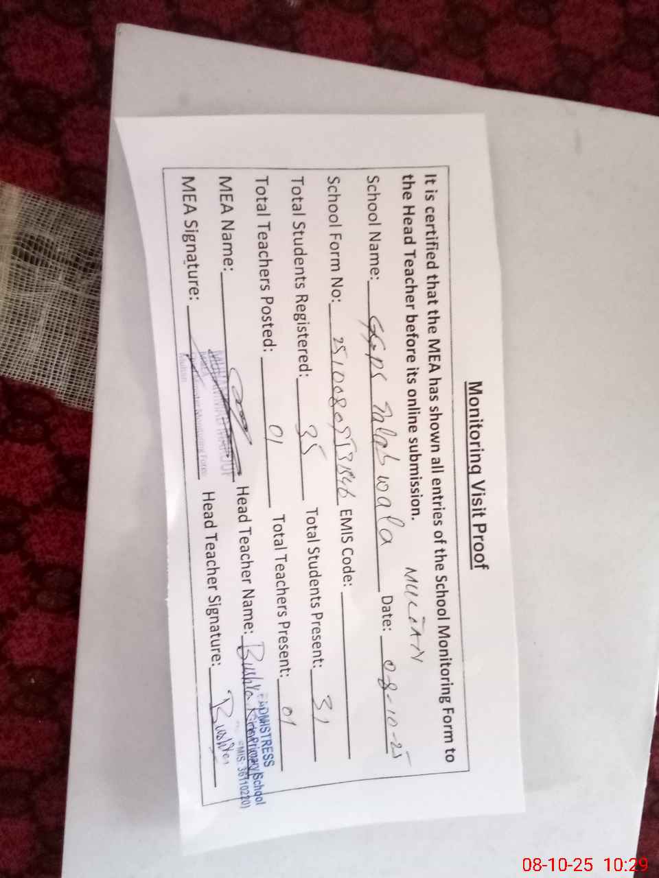 | Attendance Register | Head Teacher | MEA with School | Visit Proof |