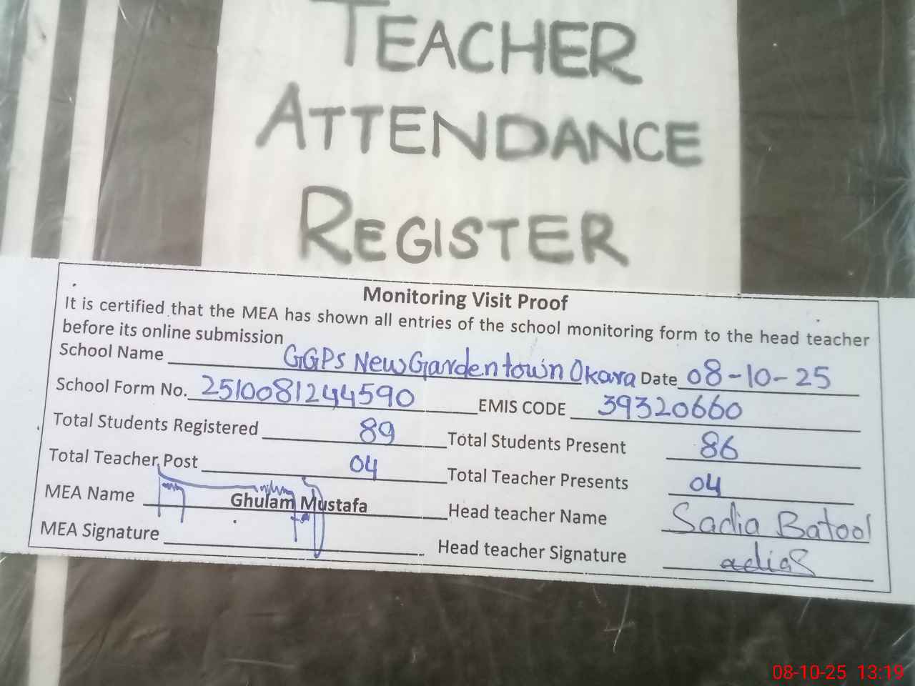 | Attendance Register | Head Teacher | MEA with School | Visit Proof |