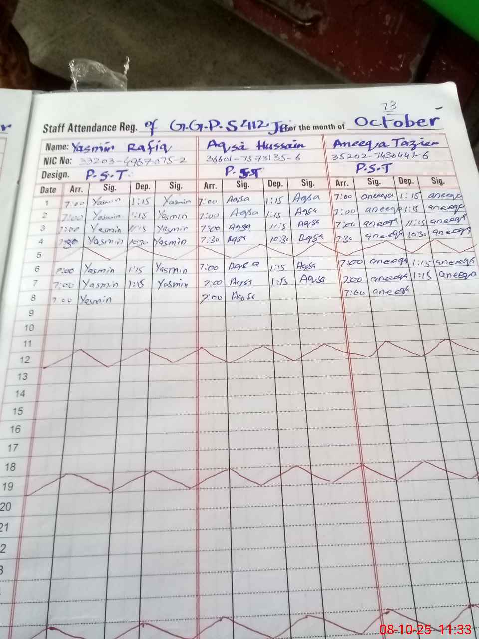| CNIC | Full Name | Designation | R/C | Absence during last cal. month |