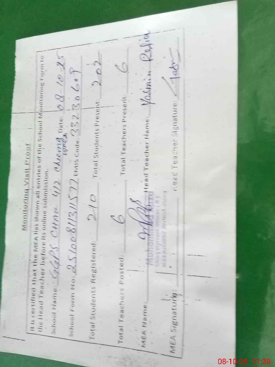 | Attendance Register | Head Teacher | MEA with School | Visit Proof |