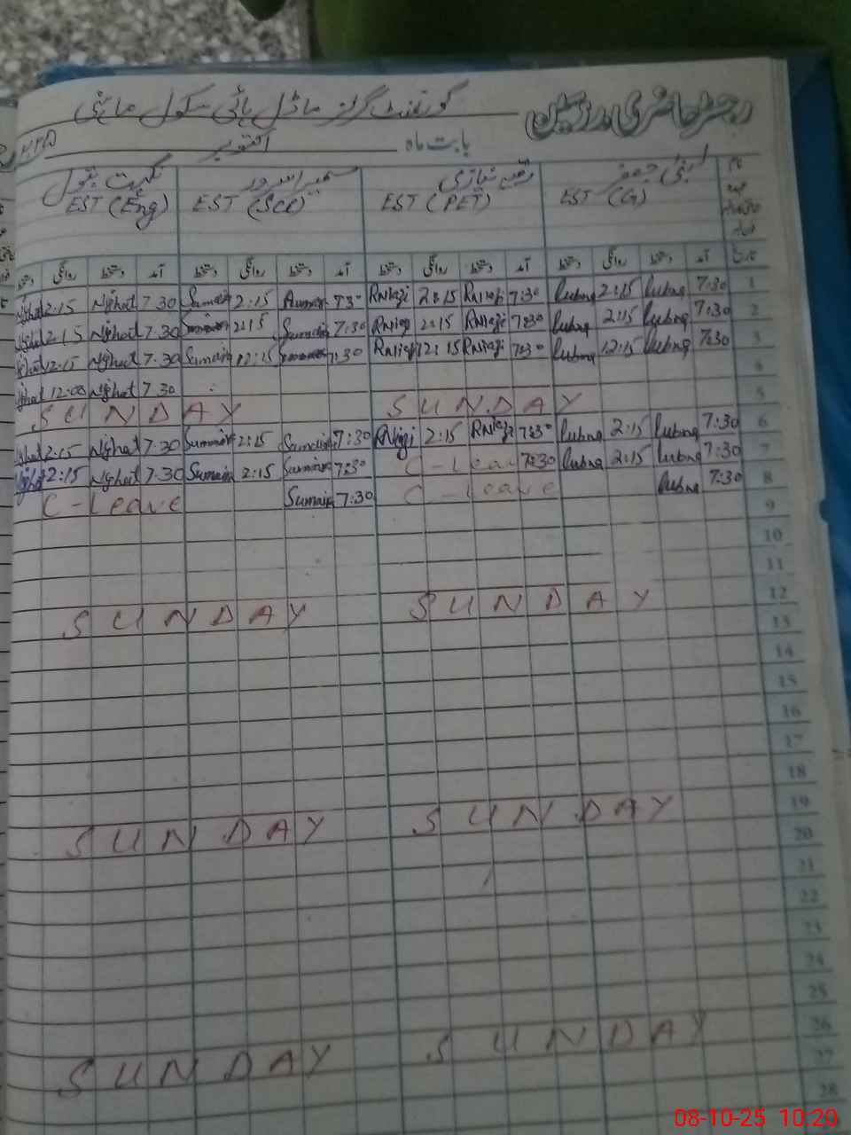 | Total no. of Classrooms: 18 No. of Classrooms Used for Teaching: 11 No. of Classrooms Storing Old Furniture, FTBs, etc: 0Comments if Any: NSB and FTF record was not available in school Raheel khan junior clark was absent from 01 October 2025 |