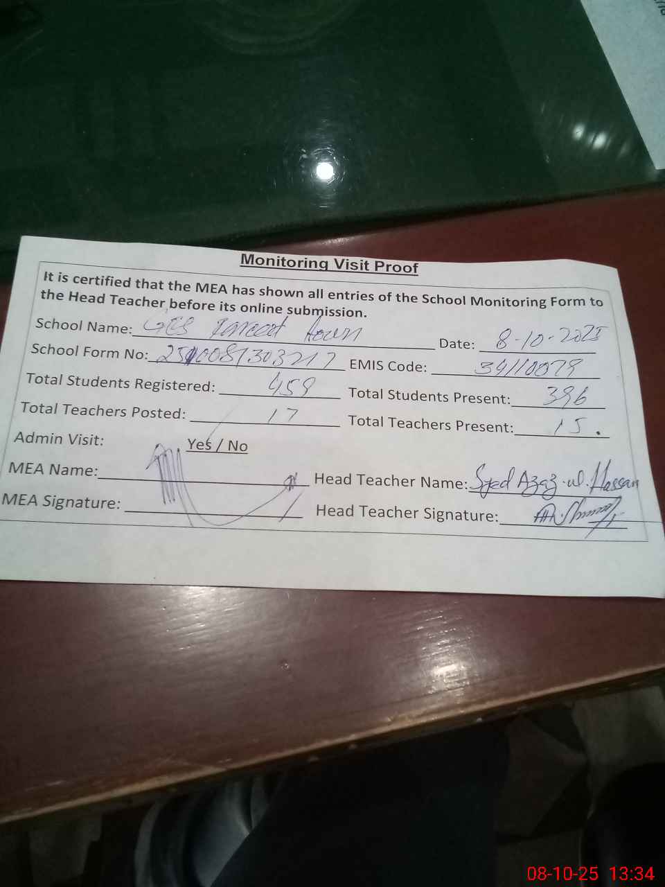 | Certified that this School was Inspected by the Undersigned MEA/DMO Today and the Information Stated Above is as Per Record. | |||||