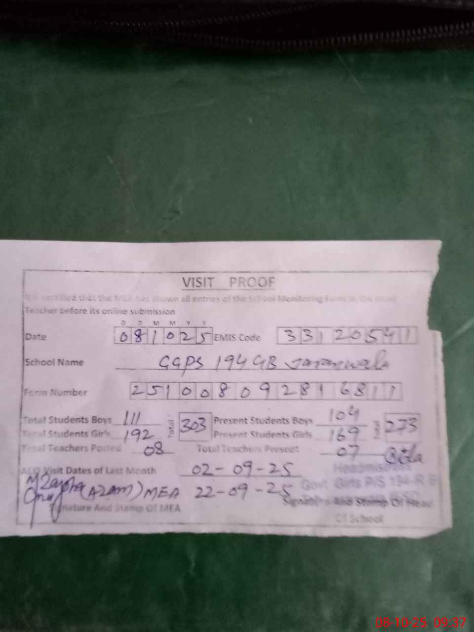 | Monitoring Date: 08-10-2025 | Start Time: 08-10-2025 09:04 AM | End Time: 08-10-2025 09:41 AM | Name of MEA: MU**** AZ**** | |