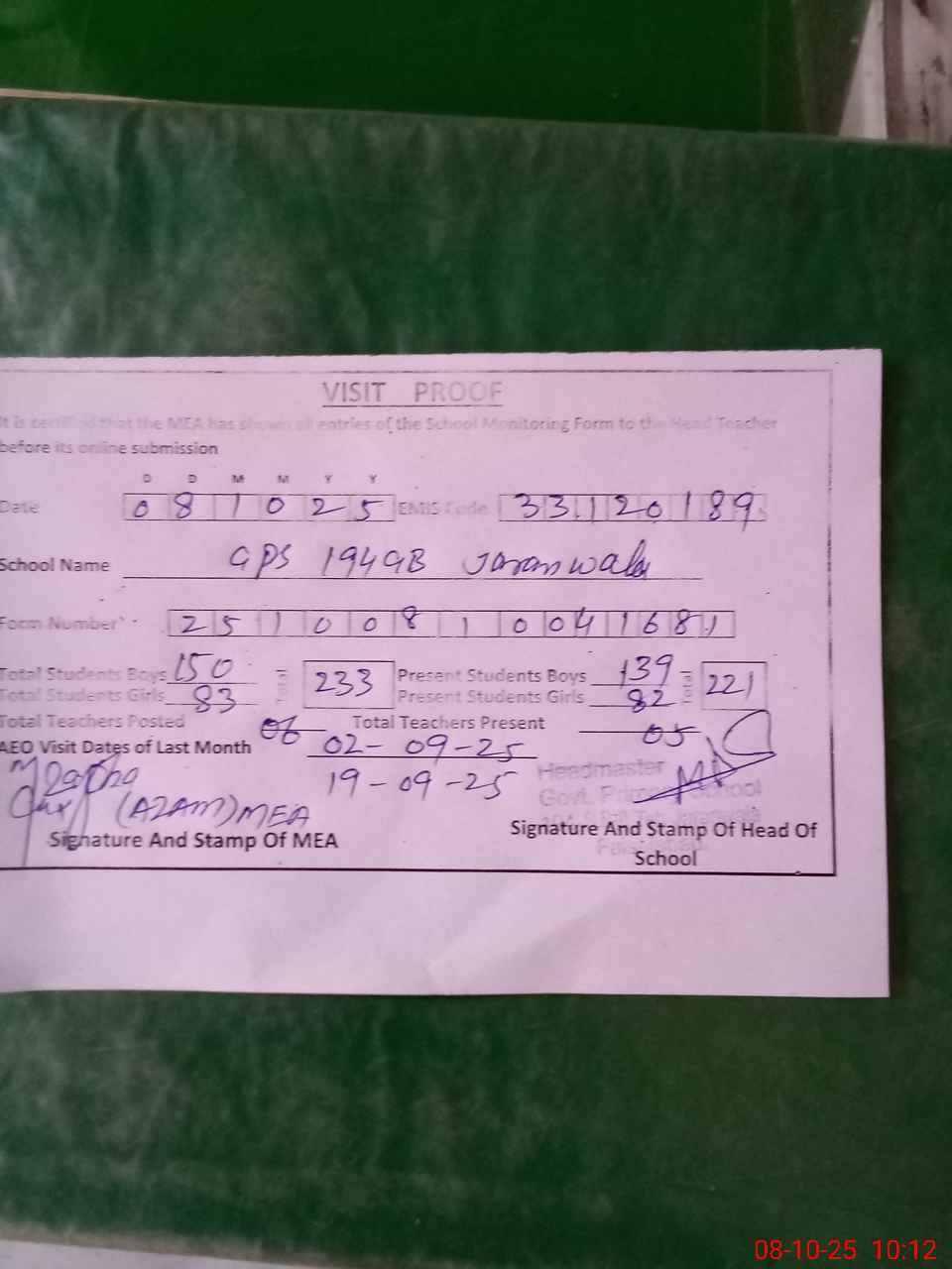 | Attendance Register | Head Teacher | MEA with School | Visit Proof |