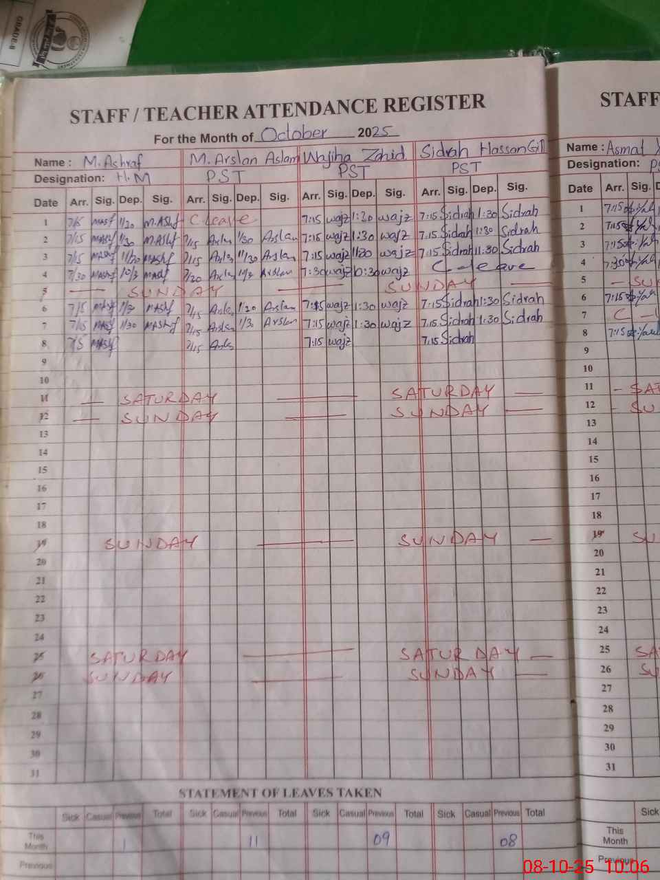 | Leave | Duty | Absent | Maternity | Medical | Ex- Pak |