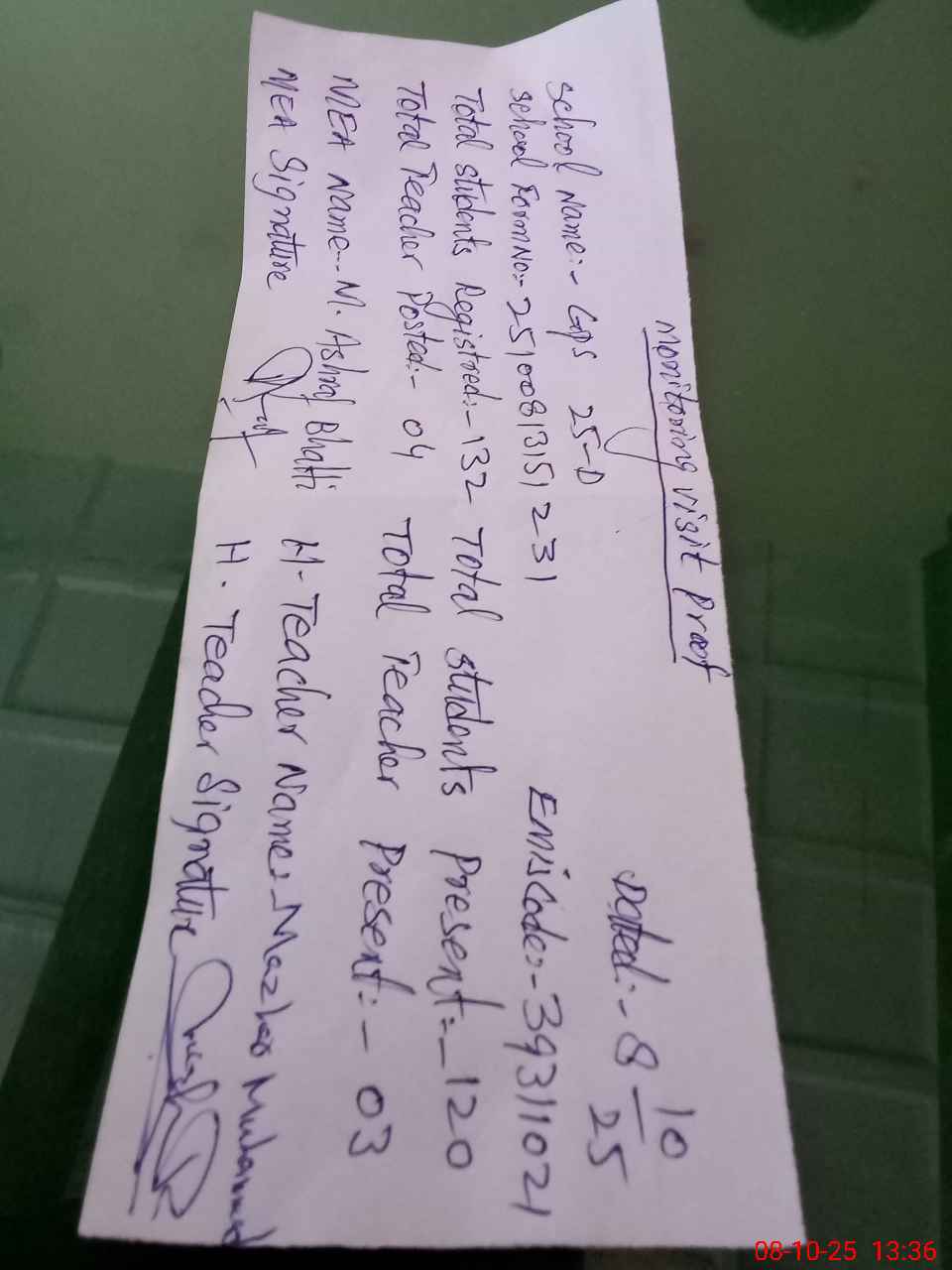 | Attendance Register | Head Teacher | MEA with School | Visit Proof |