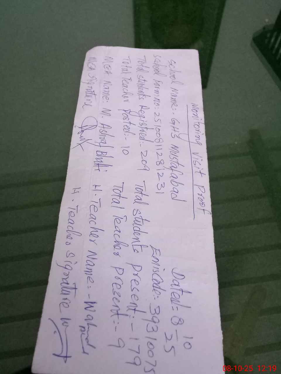 | Monitoring Date: 08-10-2025 | Start Time: 08-10-2025 11:28 AM | End Time: 08-10-2025 12:20 PM | Name of MEA: MU**** AS**** BH**** (R**** | |