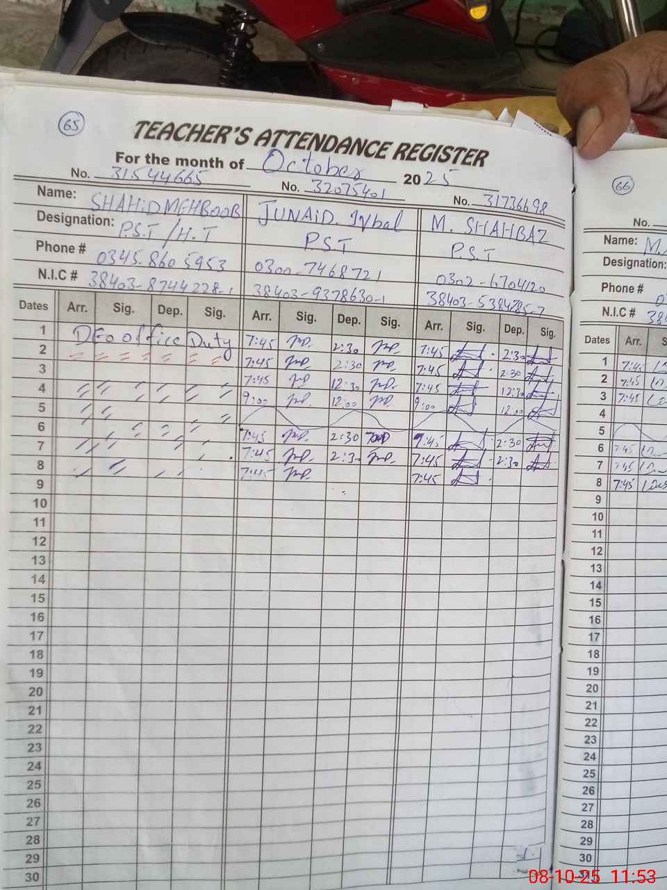| Remarks (Use Separate Page if Required): PST Shahid Mahbood is deployed in DEO office but no order available One washroom blocked due to sewerage issues | |||||