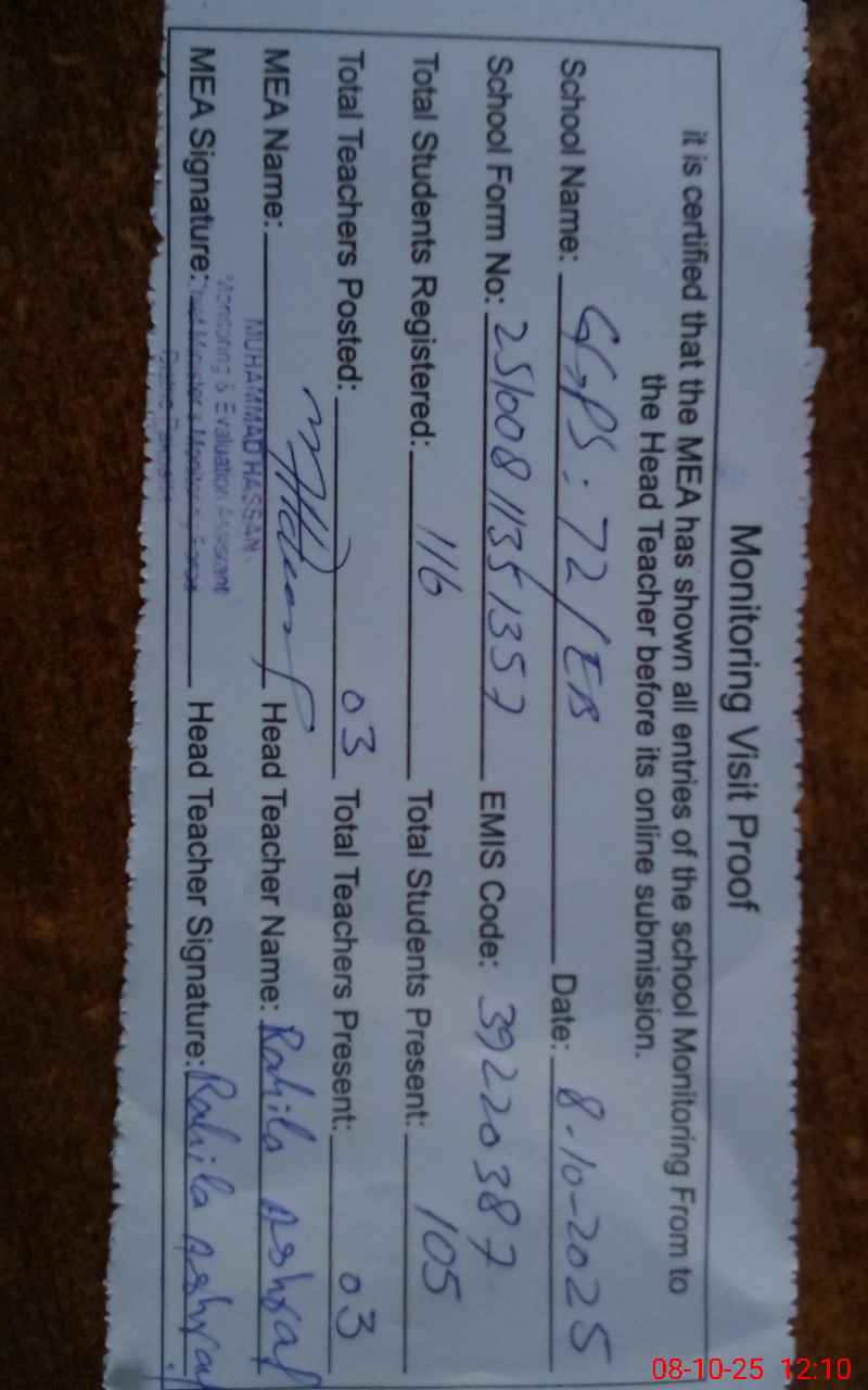 | EMIS Code: 39220387 | Name of School: GGPS 72 EB MUHAMMAD NAGAR ARIFWALA | |||