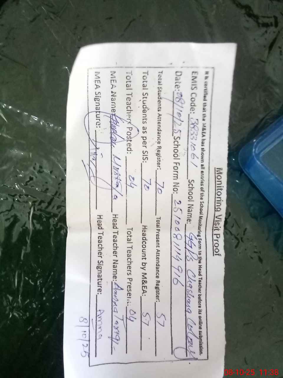 | Attendance Register | Head Teacher | MEA with School | Visit Proof |