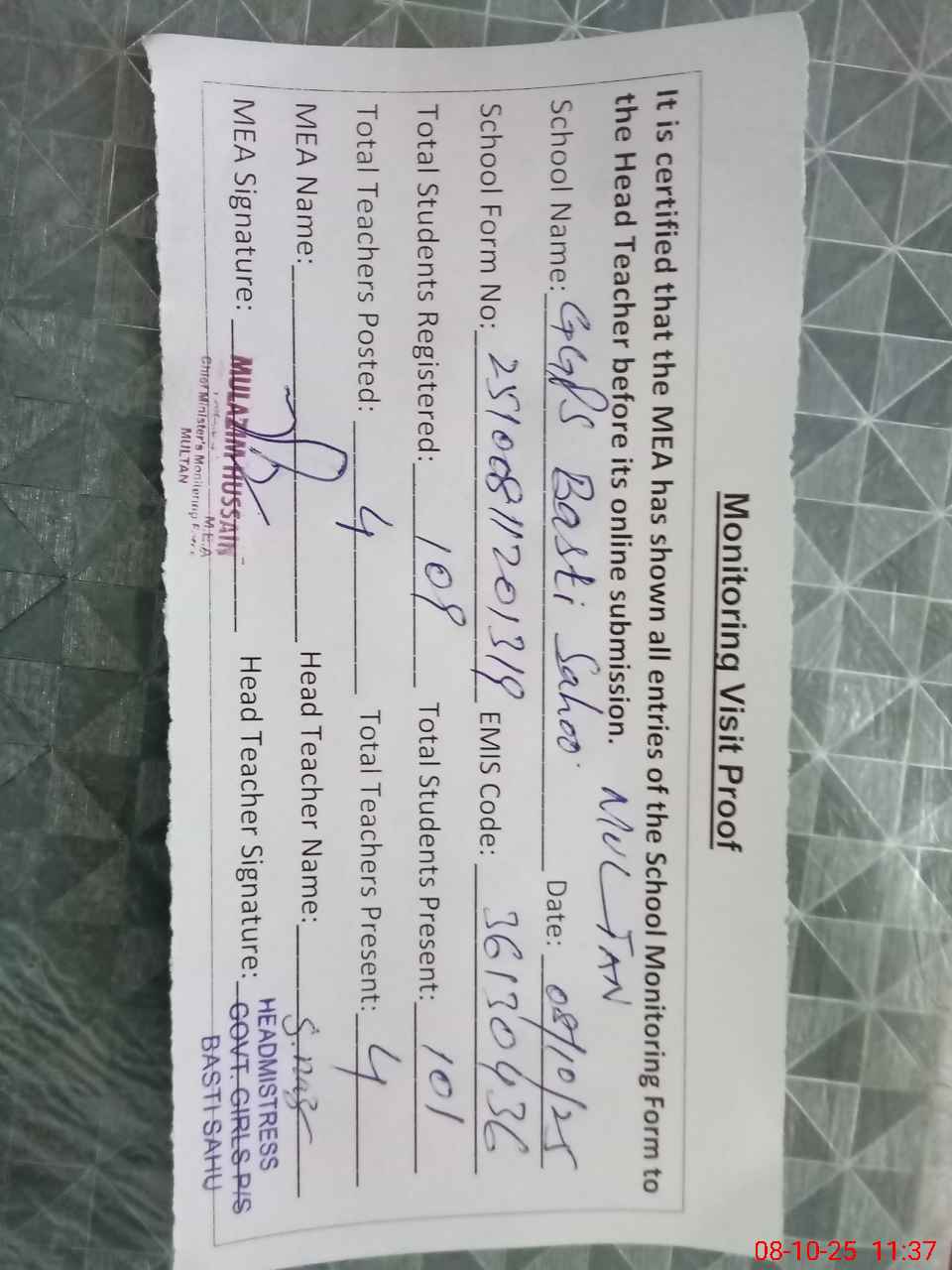 | District: MULTAN | Tehsil: MULTAN SADAR | Markaz: MAKHDOOM RASHEED - FEMALE | Level: Primary | |
