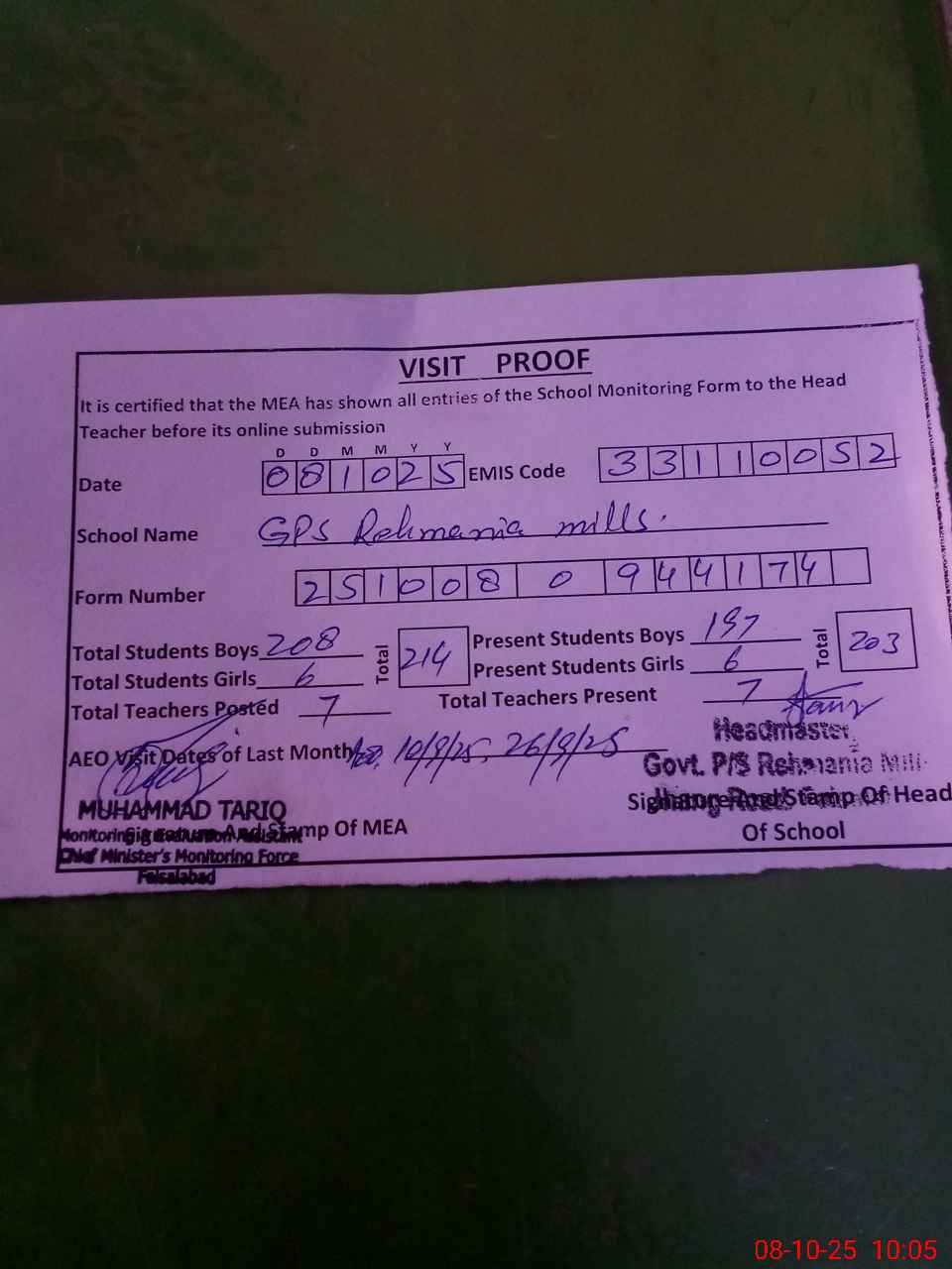 | Attendance Register | Head Teacher | MEA with School | Visit Proof |