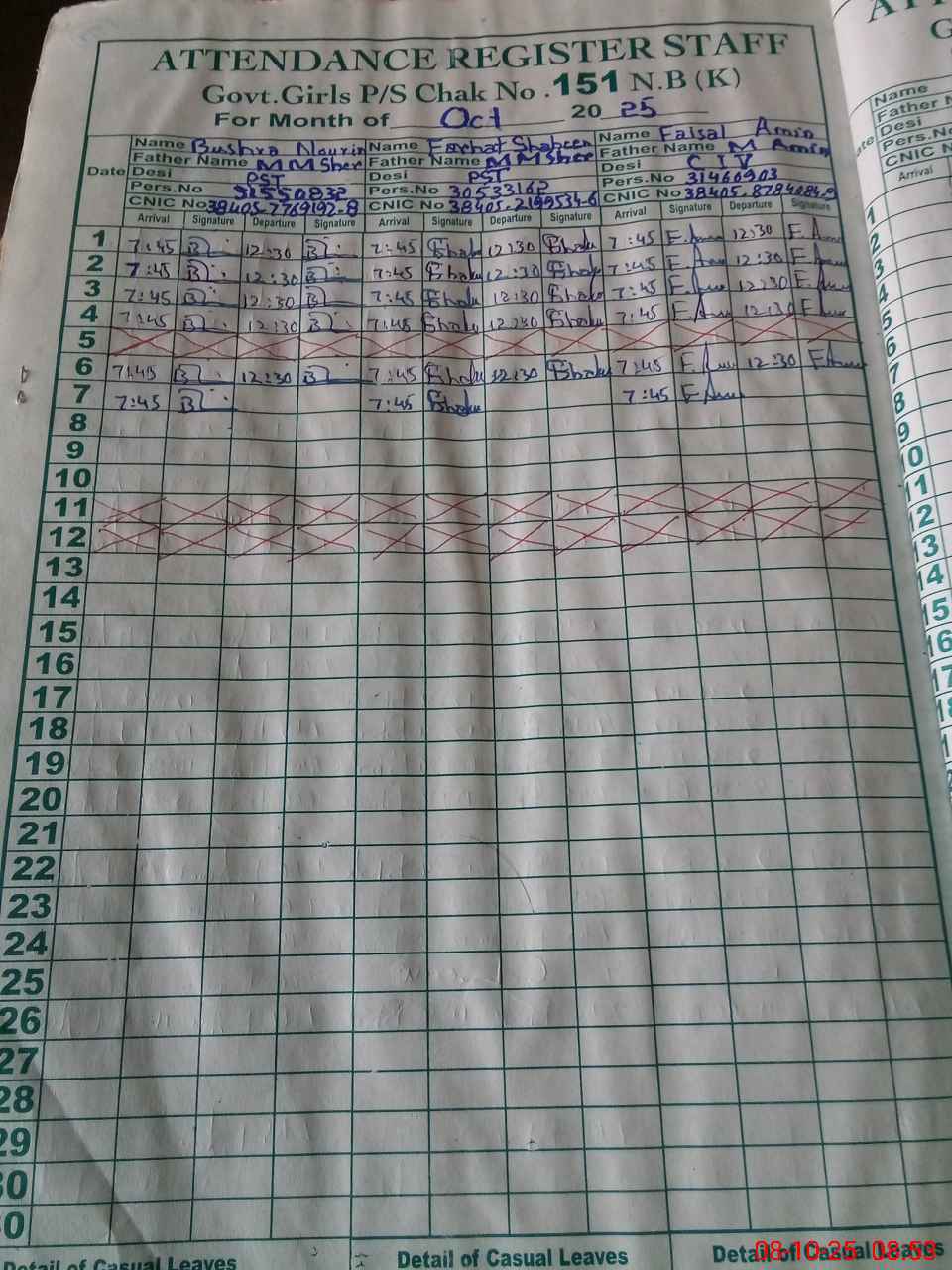 | CNIC | Full Name | Designation | R/C | Absence during last cal. month |