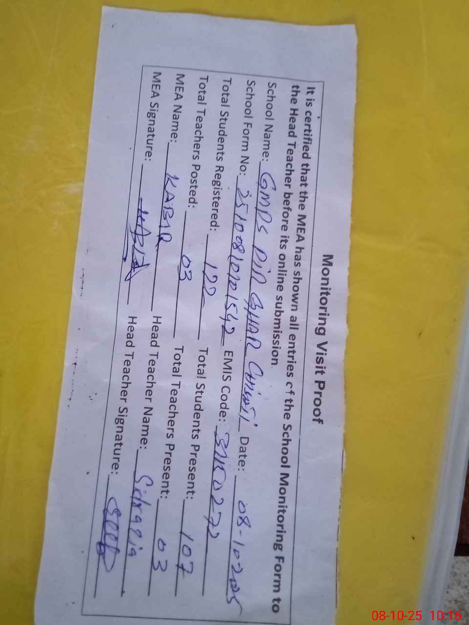 | Attendance Register | Head Teacher | MEA with School | Visit Proof |